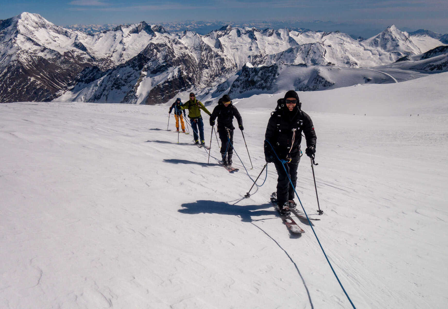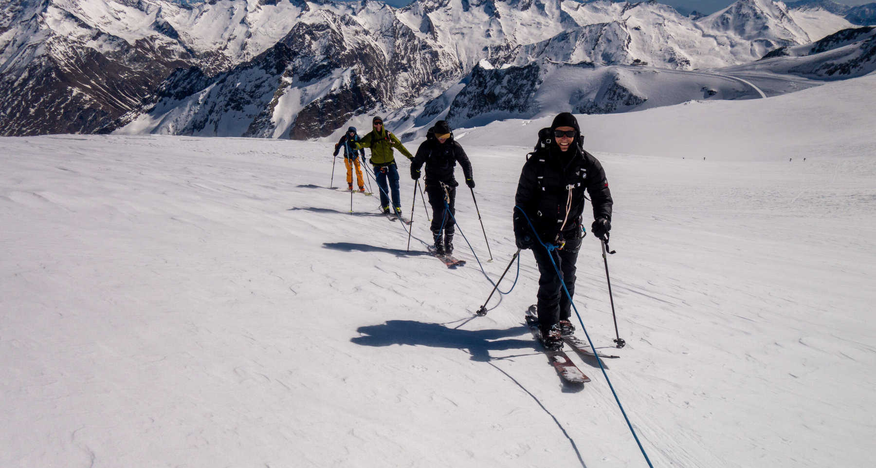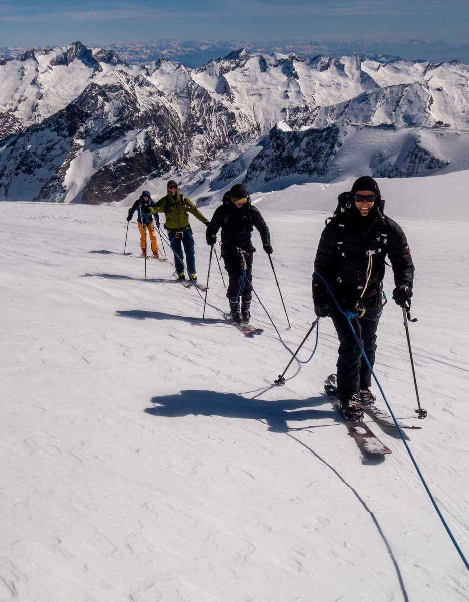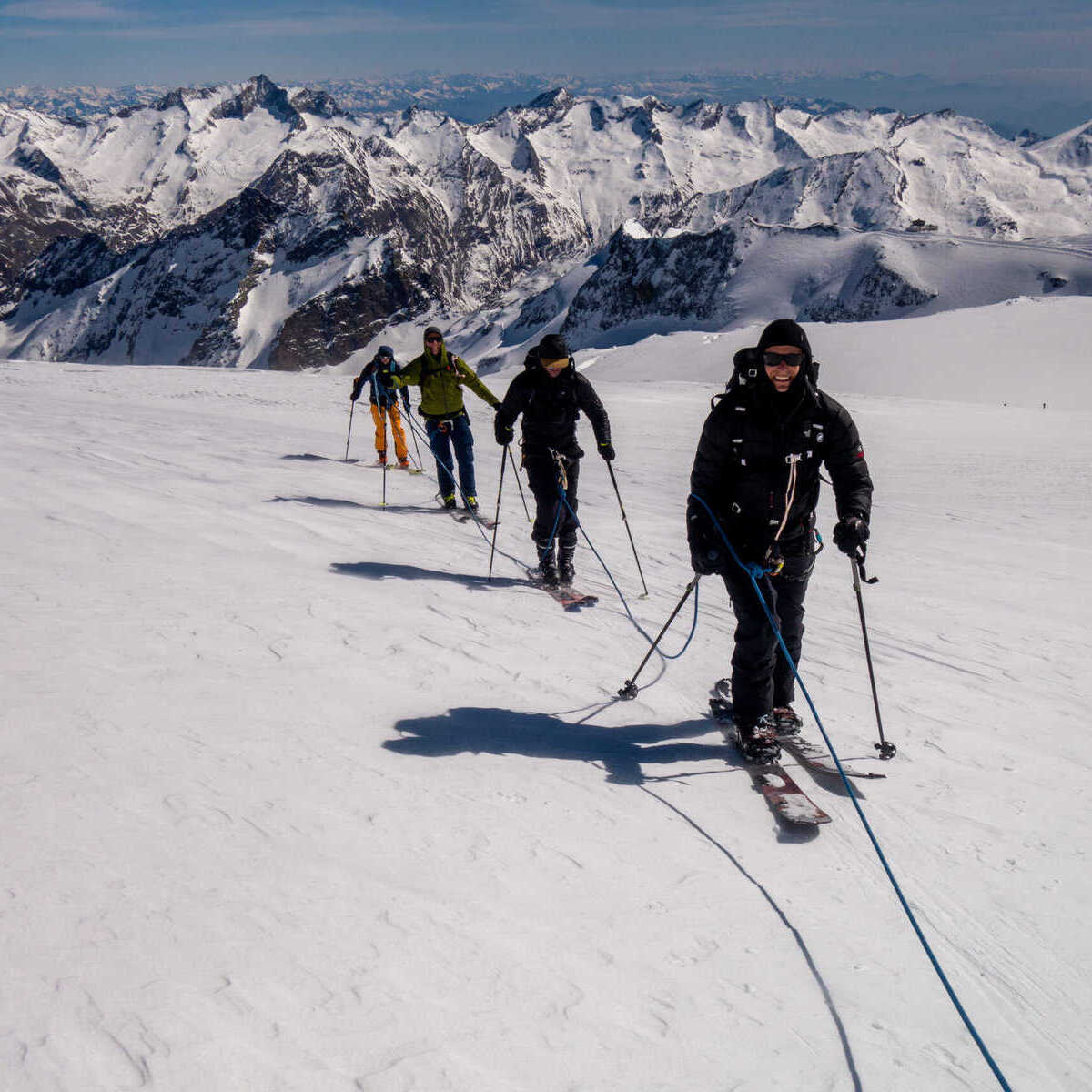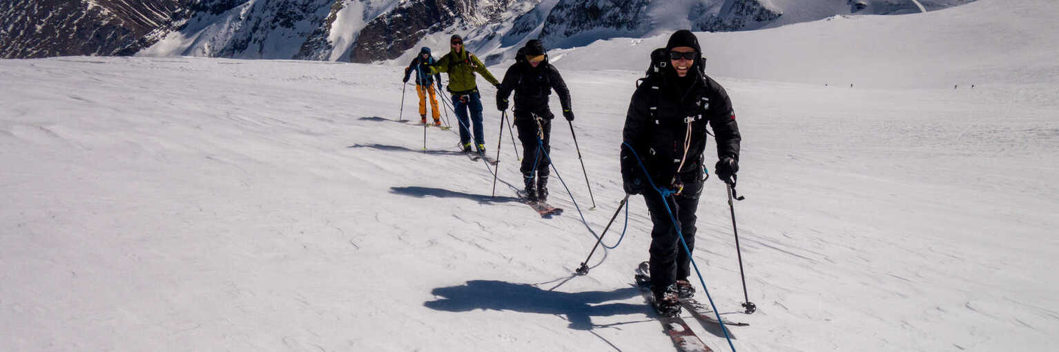 Dein Einstieg ins Hochgebirge auf Ski. Du lernst mit uns in drei Tagen die Basics für ein sicheres Mitkommen auf geführten Skihochtouren und erlebst die Welt der 4000er.