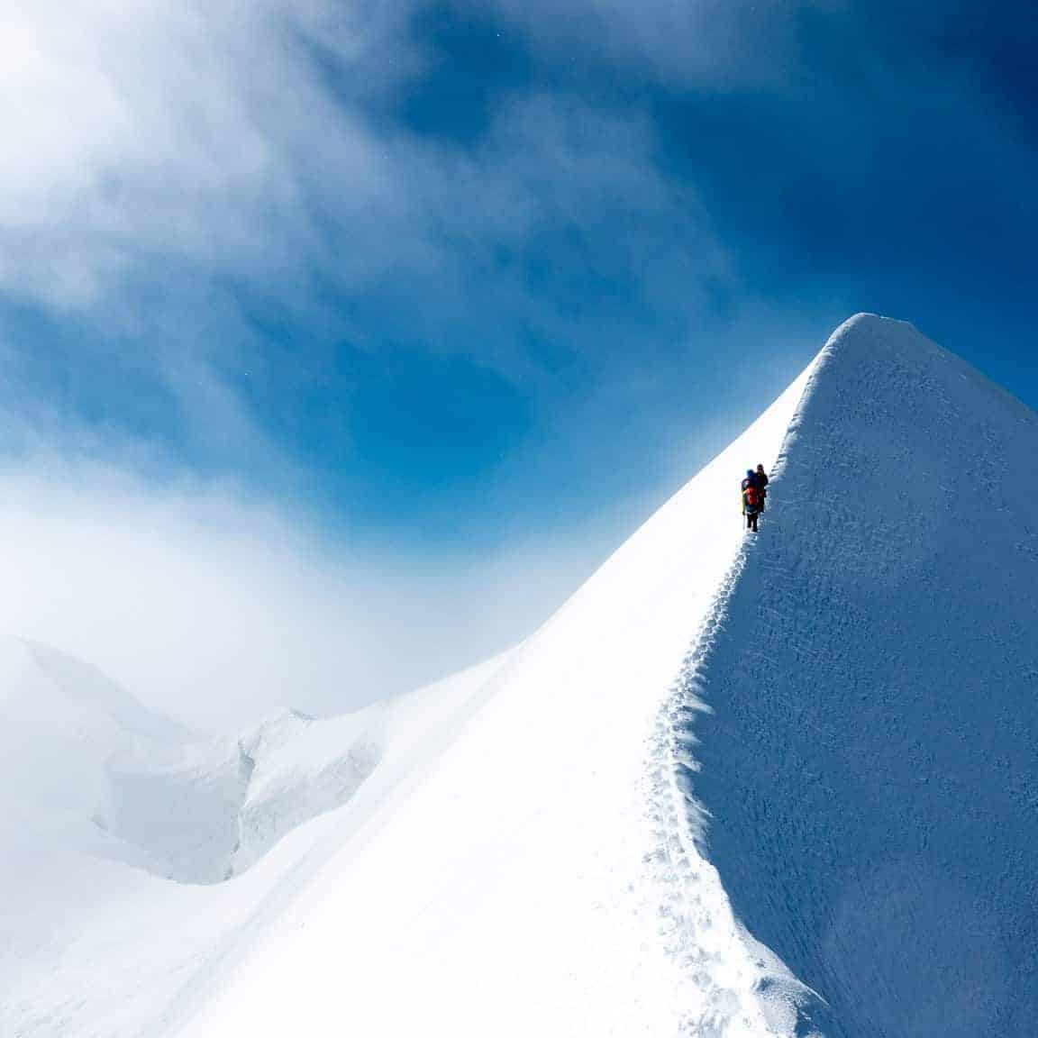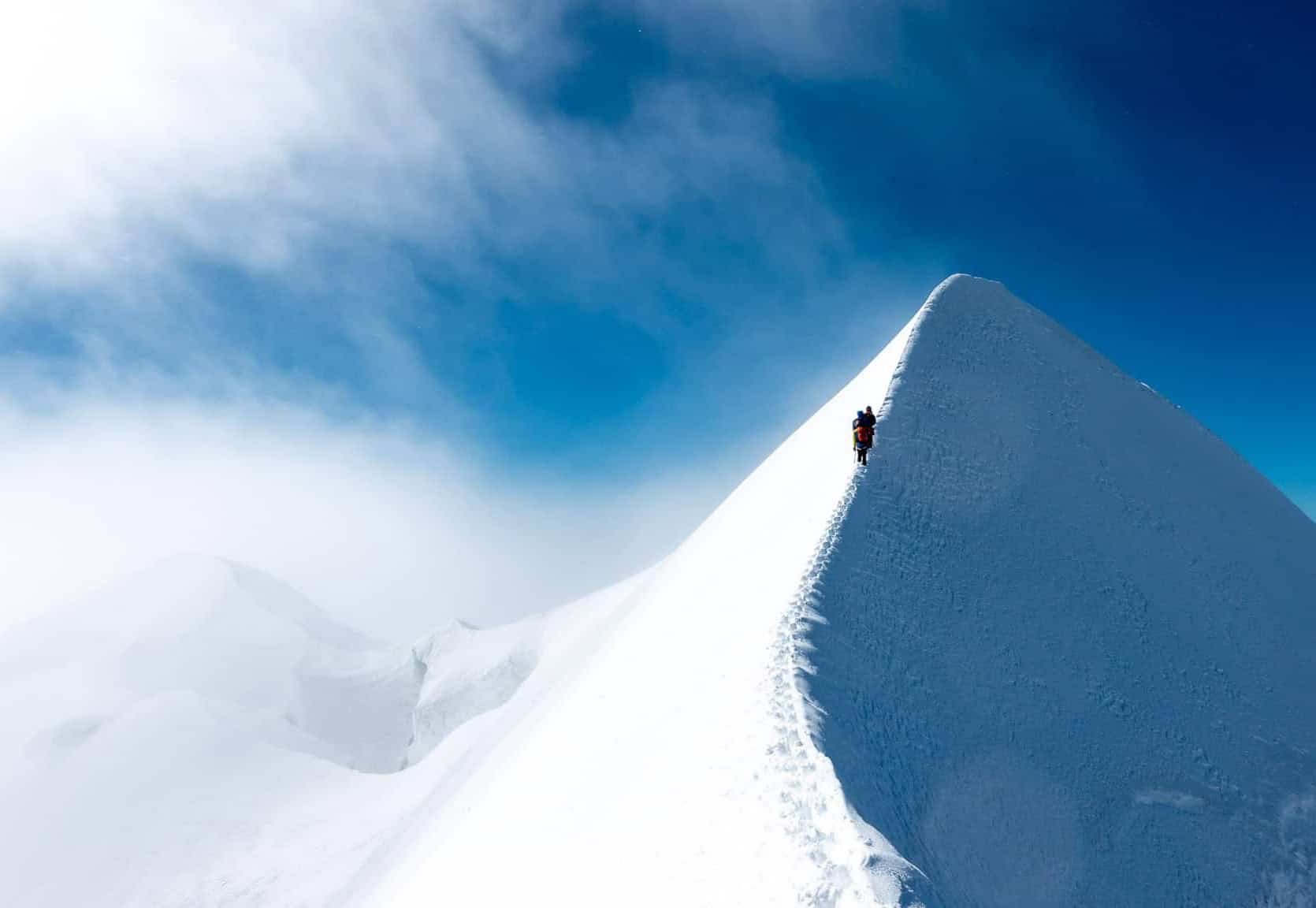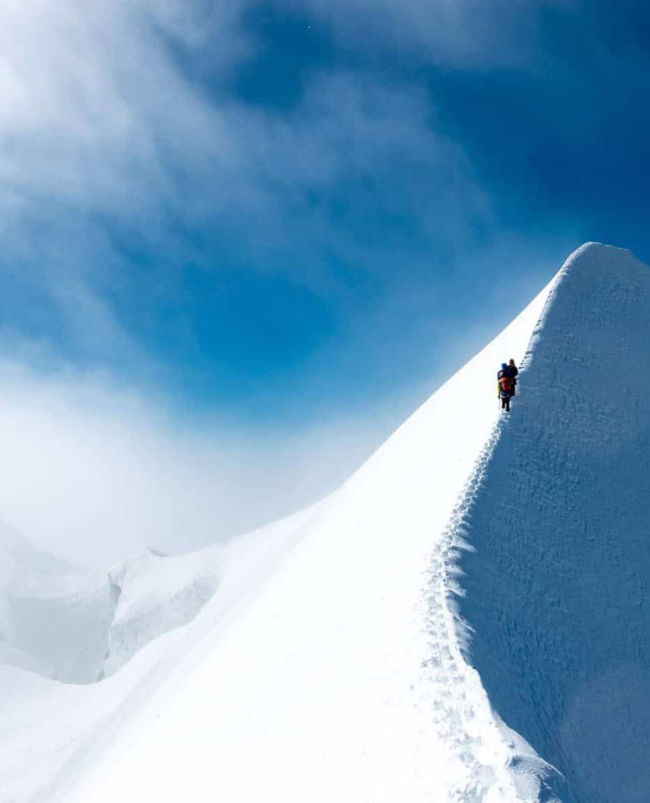 Der Aufstieg zum Naso 4100m beinhaltet leichte Felskletterei. Nach dem Fels, steigen wir im Firn und Eis cirka 45° die Firnflanke hoch.