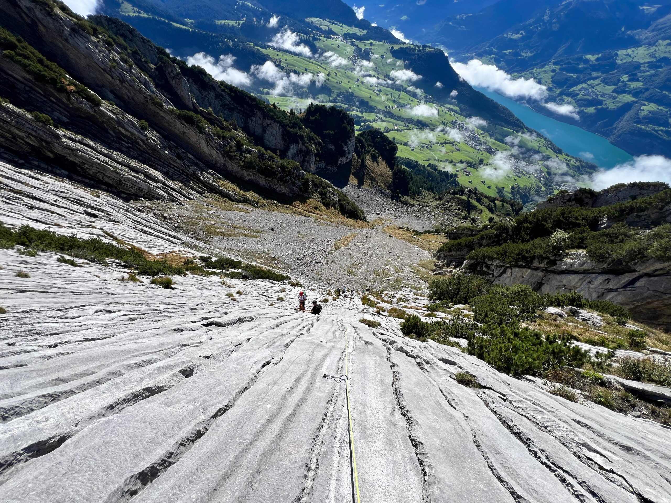 Der Tag startet mit einer gemütlichen Sesselbahnfahrt auf dem legendären Zweierlift, der uns die ersten Höhenmeter bequem hochbringt. Danach folgt ein aussichtsreicher Zustieg von etwa einer Stunde bis zur zentralen Platte. Dort beginnt die genussvolle Kletterei im rauen, von Wasserrillen durchzogenen Kalkfelsen. Wir klettern die ersten vier Seillängen im angenehmen vierten Schwierigkeitsgrad, stets mit Blick auf den tiefblauen Walensee. Nach diesen vier Seillängen folgt ein kurzer Fussabstieg zum Einstieg in den nächsten Kletterabschnitt, der nochmals einige tolle Klettermeter im charakteristischen Kalkfelsen bietet. Oben angekommen wartet zum Abschluss eine luftige Gratüberschreitung bis zum Gipfel, mit grandioser Aussicht ins Zürcher Oberland bis hin zum Schwarzwald. Auf dem Gipfel geniessen wir die eindrückliche Panorama-Aussicht und stärken uns mit unserem wohlverdienten Lunch.