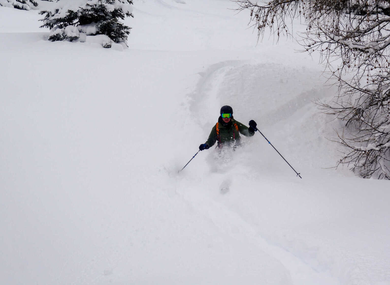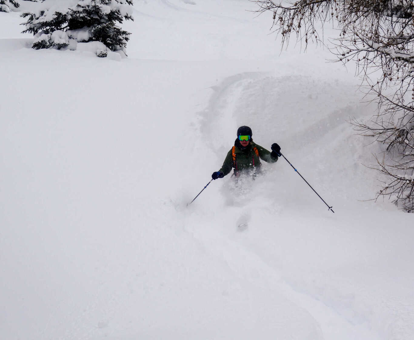 The beautiful fresh snow brings us to the Schächental. We enjoy long treeruns across the alpine meadows. We make 2-3 descents with railway support before the first clearings appear in the afternoon. Then we put on our skins and head into new, untracked terrain.
