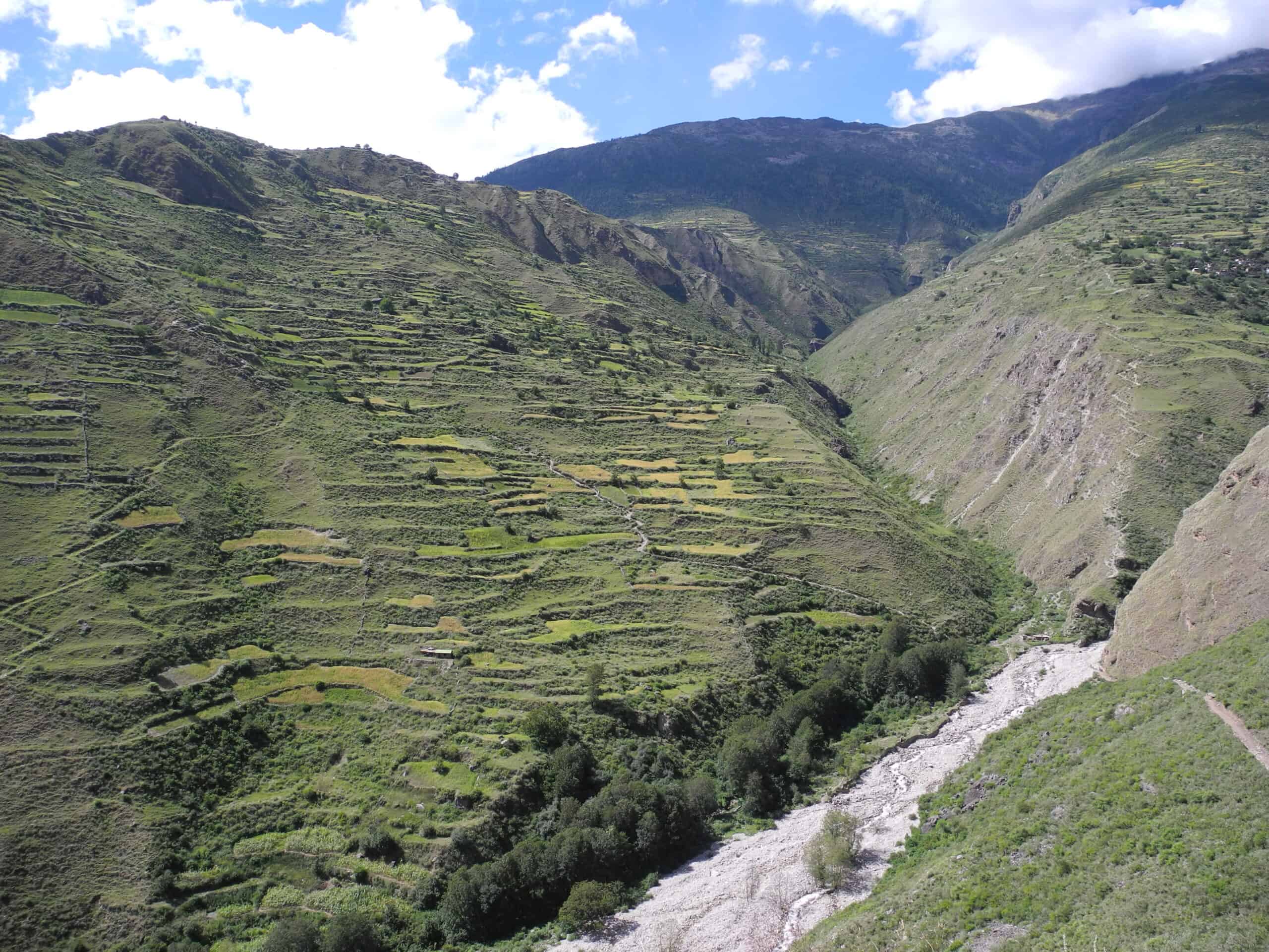 Trekking along the Hinku Khola. Gradual gain in altitude and first high alpine vegetation.